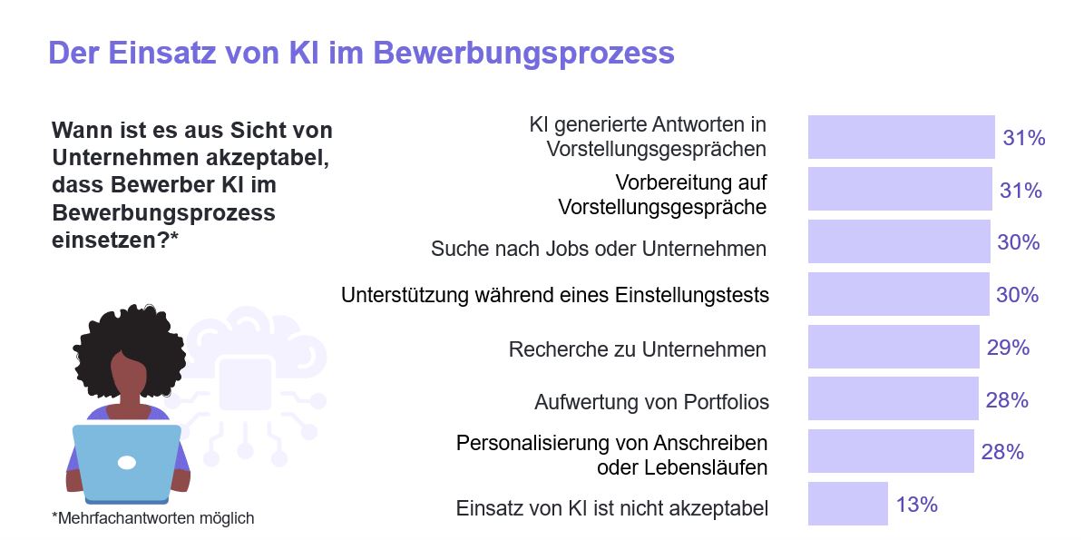 Bezüglich der Akzeptanz der Nutzung von KI in Bewerbungsprozessen durch Bewerber geben nur 13% der Unternehmen an, diese komplett abzulehnen. Etwa 30% der Unternehmen sehen verschiedene Einsatzoptionen als akzeptabel an (Mehrfachnennung möglich).