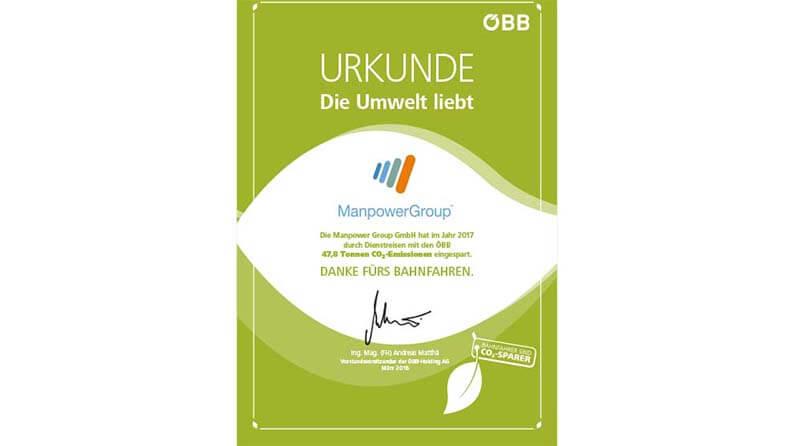 ManpowerGroup GmbH Österreich mit den Marken Manpower und Experis hat im Jahr 2017 durch Dienstreisen mit den ÖBB 47,8 Tonnen CO2-Emissionen eingespart. Dafür erhielten wir vor kurzem von der ÖBB als einer der Top 100 Businesskunden eine Urkunde mit einem nachhaltigen Dankeschön.